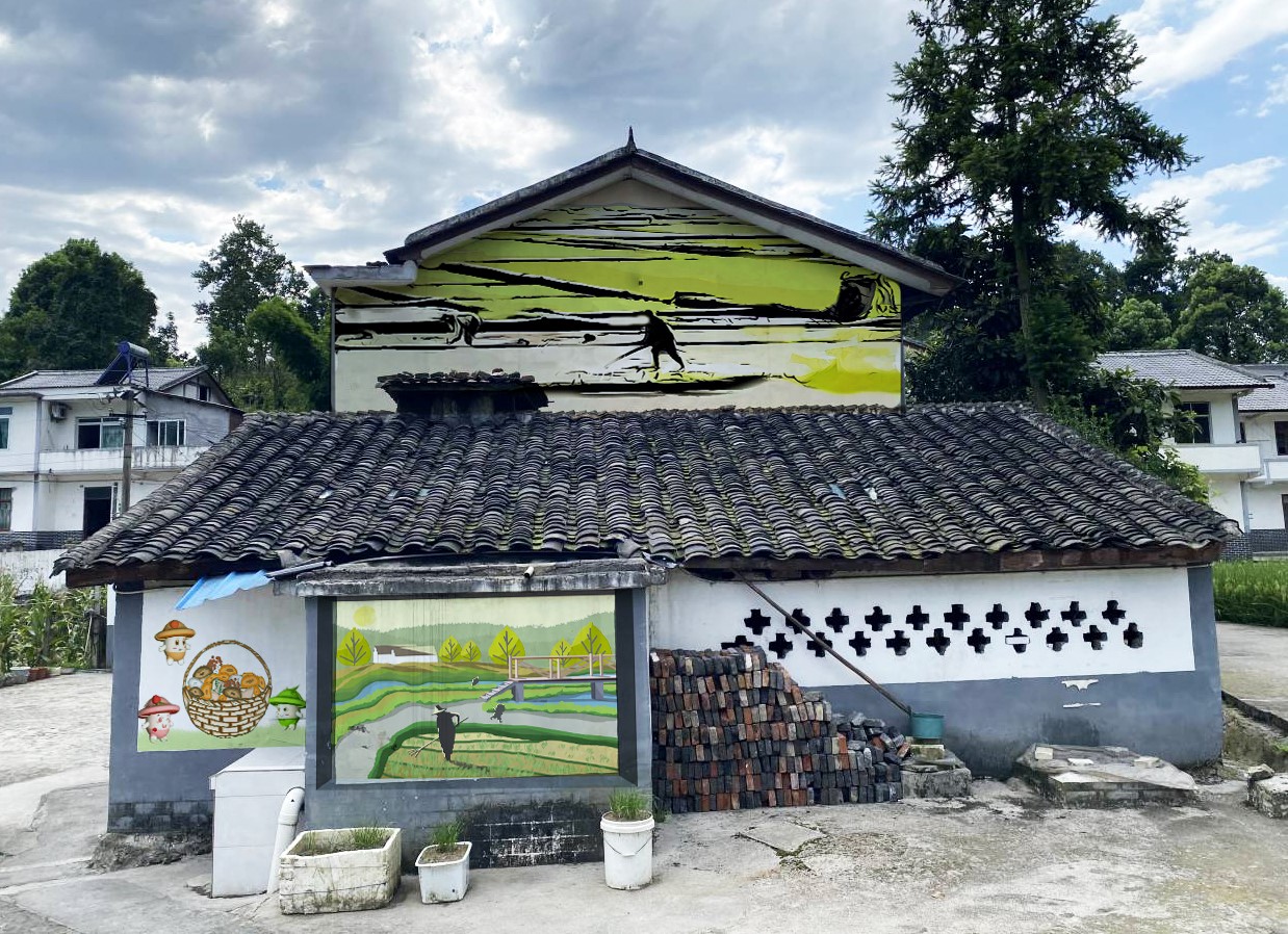 三、艺术墙绘设计:选择“农耕文化,井、竹、蘑菇文化,诗意田园文化”为创作主题,结合建筑外墙绘制《藕花深处》《诗意田园》《竹源》等艺术绘画作品,绘制展示绿水村和谐之丽、恬静之美、文明之美、友爱之美、田园之美。