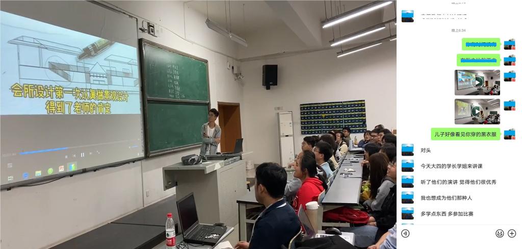 杨涛学长精彩的视频分享温暖感人,记录了他从大一新生到大四学霸的心路历程:高考时笃定志向,大学伊始常常被工程字体和配景练习折磨,成绩平平的他也有过迷茫,但是从来没有放弃过自己的理想和对专业的热爱。通过脚踏实地努力付出,逐步提升专业设计能力,重拾信心。进入大三后,专业课程的深度学习,良好的师生和同学关系,对学习的热爱、对专业的执著、对理想的坚持,大量学科竞赛、团学活动的参与,使得他的专业能力和个人综合素质得到前所未有的提升。各种有趣的调研与实践课程开阔了视野,加深了对工程项目的认知,让自己重新审视设计,每次的获奖也总是让他感叹付出总会有收获。所以他告诫每一位同学不要放弃坚持。杨涛学长的精彩发言感动了在座的师生,引得无数人瞬间泪目,更有同学当场暗下决心一定要成为像学长一样优秀的人。