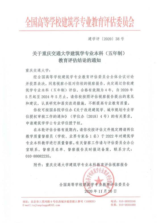 11月20日,全国高等学校建筑学专业教育评估委员会下发《关于重庆交通大学建筑学专业本科(五年制)教育评估结论的通知》(建学评[2020]38号)文件,经全国高等学校建筑学专业教育评估委员会全体会议讨论并投票表决,决定通过我校建筑学专业本科(五年制)教育评估,同时,我校可按国务院学位办相关文件的要求申请建筑学学士学位授予权。