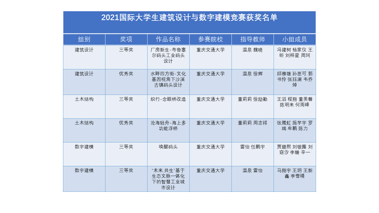 2021年10月11日,由“一带一路”国际建筑大学联盟(The Belt and RoadArchitectural University International Consortium,简称BRAUIC)发起,北京建筑大学主办的“2021年‘一带一路’建筑类大学国际联盟大学生建筑和数字建模竞赛”宣布了竞赛结果。我校建筑与城市规划学院八个参赛小组参加了包括建筑设计及数字建模等全部类别的比赛项目,并收获六项奖项,奖项数量为历次参赛最高。其中获得建筑设计方向三等奖一项,优秀奖一项;土木结构方向三等奖一项,优秀奖一项;建筑与场景数字建模方向三等奖两项;我校荣获优秀组织奖,我校董莉莉、温泉、魏晓、雷怡、任鹏宇等多位老师获得优秀指导教师奖。