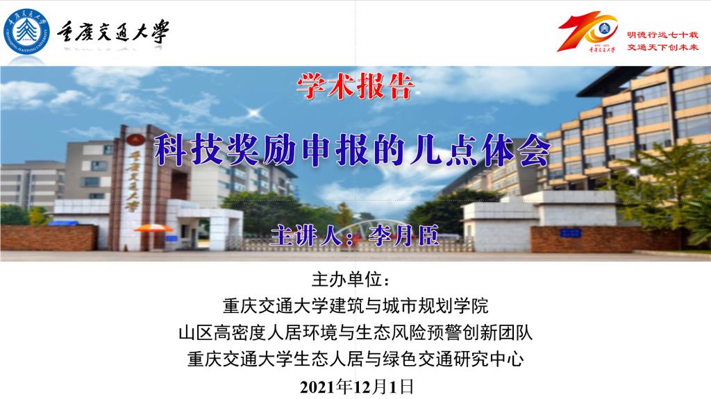 2021年12月01日14:00时,应重庆交通大学山区高密度人居环境与生态风险预警创新团队邀请,西南大学地理科学学院李月臣教授在腾讯会议作了题为“科技奖励申报的几点体会”的线上学术报告。李月臣教授是重庆市高校中青年骨干教师,兼任国际城市生态学会中国分会常务理事、国际数字地球学会中国国家委员会数字山地专委会委员、重庆市城市规划学会常务理事和重庆市地理学会地图与地理信息系统专业委员会副主任。