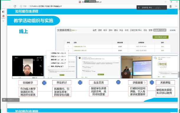 风景园林系副主任罗融融老师以《交通景观概论》为例,分享了在线课程教学与建设经验,以为什么要建在线课程?什么是在线课程?如何建好在线课程为逻辑主线,重点从教学内容挖掘与呈现、教学活动组织与实施、教学成效考核与评价等方面进行了详细介绍。罗老师从宏观构建出发,逐一落脚到微观细节,思路清晰明确,娓娓道来,如沐春风。