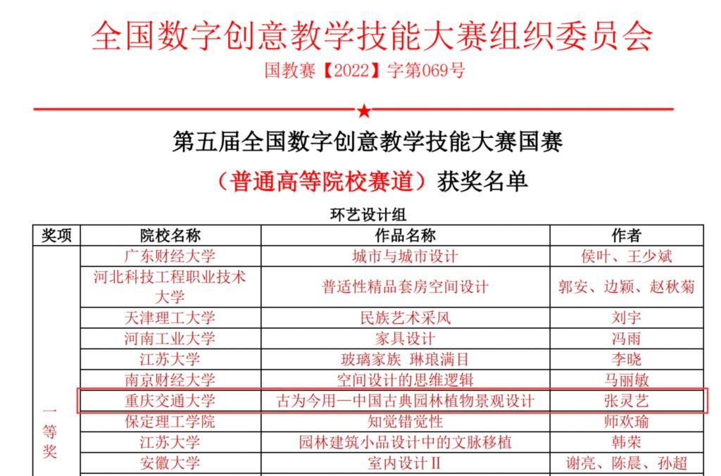 近日,全国数字创意教学技能大赛组委会传来喜讯,我校伟德体育官网风景园林系教师张灵艺在第五届全国数字创意教学技能大赛中荣获环艺设计组一等奖。