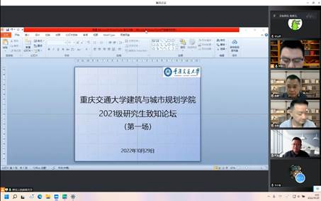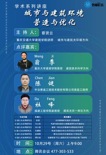 2022年10月29日上午9:00,伟德体育官网2021级研究生致知论坛专题讲座第一场以腾讯会议的形式在线上举行。6名2021级土木水利专业研究生紧密围绕“城市与建筑环境营造与优化”这一主题汇报了近期的研究成果。本场专题讲座由我院建筑系老师蔡贤云主持,同时邀请重庆大学建筑城规学院副院长翁季教授、中冶赛迪工程技术股份有限公司建筑设计研究院总建筑师陈健高级工程师和福建工程学院建筑与城乡规划学院建筑系主任杜峰副教授作为点评嘉宾对6名研究生的报告作了精彩点评。