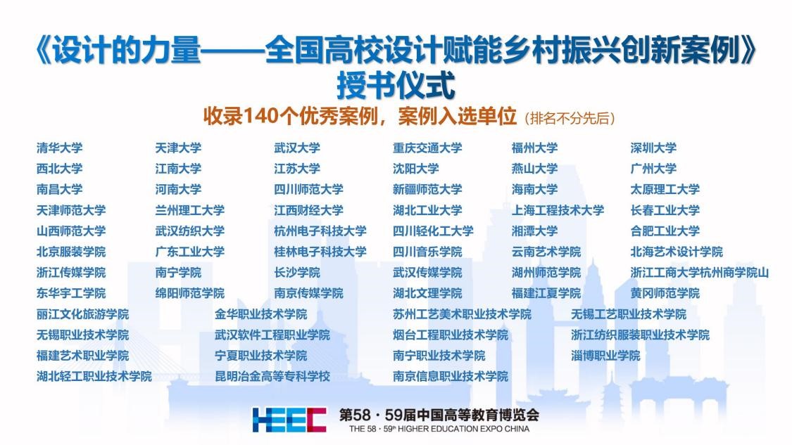 据悉,《设计的力量——全国高校设计赋能乡村振兴创新案例》新书发布仪式为第58·59届中国高博会“高校教育赋能乡村振兴发展大会”主论坛的重要环节,在为期两天的大会中,除了主论坛,大会还设有“设计赋能乡村振兴创新教育”和“高等学校服务乡村振兴典型案例交流”两个主题分论坛。论坛以“赋能乡村振兴,共富美丽中国”为主题,旨在交流设计赋能乡村振兴的经验,探讨高校教育赋能乡村振兴的新路径、新方法。