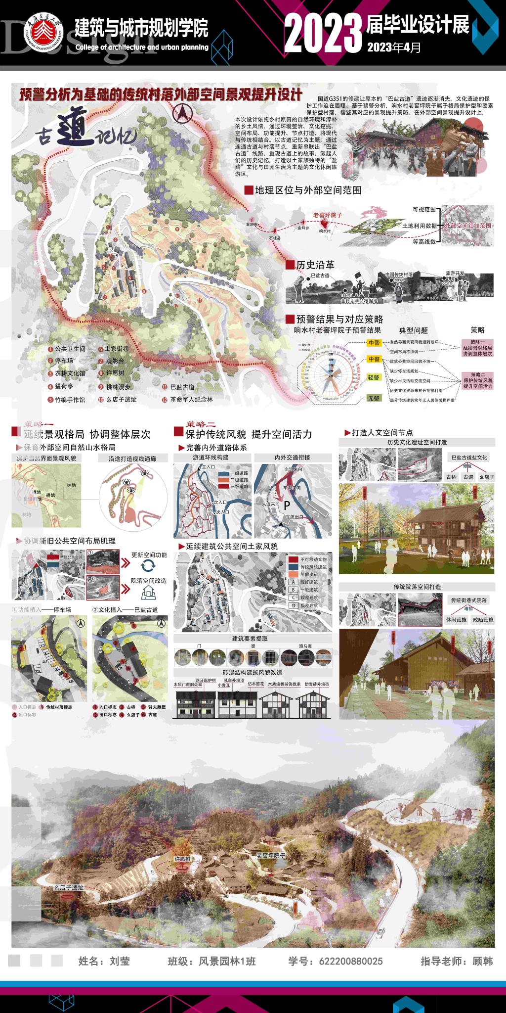 2023年4月28 日,2023届风景园林专业硕士毕业设计作品展在重庆交通大学南岸校区第二教学楼负一楼展厅拉开帷幕。本次毕业展共计展出2020级风景园林专硕32名研究生的毕业设计作品。作品题目涵盖老旧社区适老化改造设计、长江中上游交通景观风貌提升、重庆传统村落景观保护、山城步道健康效益提升、重庆两江四岸功能更新等前沿热点及地方需求领域,是研究生们在校内导师和企业导师指导下,依托风景园林生产实践项目产出的研究性设计成果。