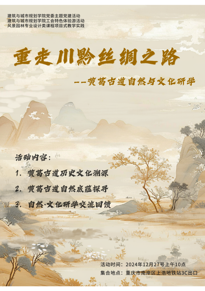 2024年12月27日上午10点,在伟德体育官网学院党委和工会的大力支持下,在重庆黄葛古道成功举办了风景园林项目式教学实践活动,林孝松副院长参与了本次活动。此次活动以风景园林规划与设计课程——《自然教育&文化研学项目策划与营地设计》为依托,教师团队在新的行业背景下,对课程进行了创新改革,将传统规划设计课程升级为集规划设计、项目策划与实践落地于一体的综合课程。同学们在营地规划设计的基础上,进一步策划自然教育或文化研学活动,并进行实地演练。经过班级内部激烈的演讲竞争,最终有2个策划方案脱颖而出,获得落地实践的机会。活动招募海报一经发布,吸引了众多师生的踊跃报名。