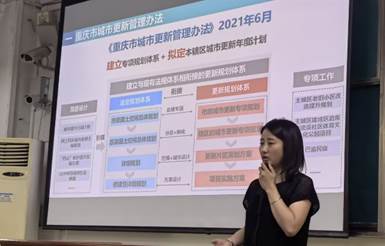 胡羽工程师通过重庆市市级专项规划到区级专项规划再到片区专项规划的层级递进,讲述了城市更新不同维度的更新策略。分别从城市更新管理办法、项目规划管理指导意见、城市更新设计导则、政策扶持等方面展开了重庆市城市更新现状的介绍。针对城市更新项目推进过程中发现的实际问题,分别从区域空间调查、标准编制思路、发展建议、设计方法与设计策略,并结合实际参与主持的示范项目“重庆市九龙坡区谢家湾民主村”进行了细致地讲解。在此基础上结合鹅岭二厂、北仓文创街区等实际案例,讲述了城市更新设计思路,拓宽了原有城市更新的概念内涵。