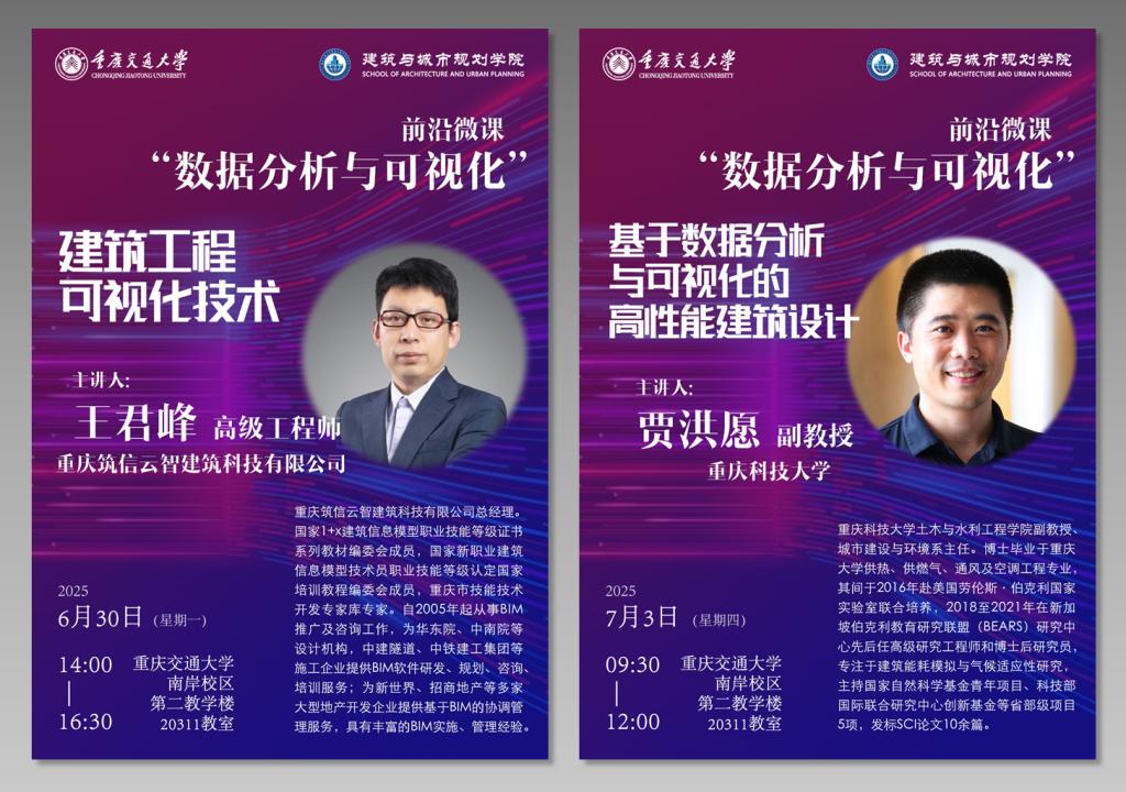 2025年6月30日与7月3日,伟德体育官网举办了前沿微课“数据分析与可视化”的系列讲座活动。第一场讲座邀请了重庆筑信云智建筑科技有限公司的王君峰总经理主讲,第二场讲座邀请了重庆科技大学城市建设与环境系主任的贾洪愿副教授主讲,讲座由伟德体育官网建筑系教师熊杰博士主持。