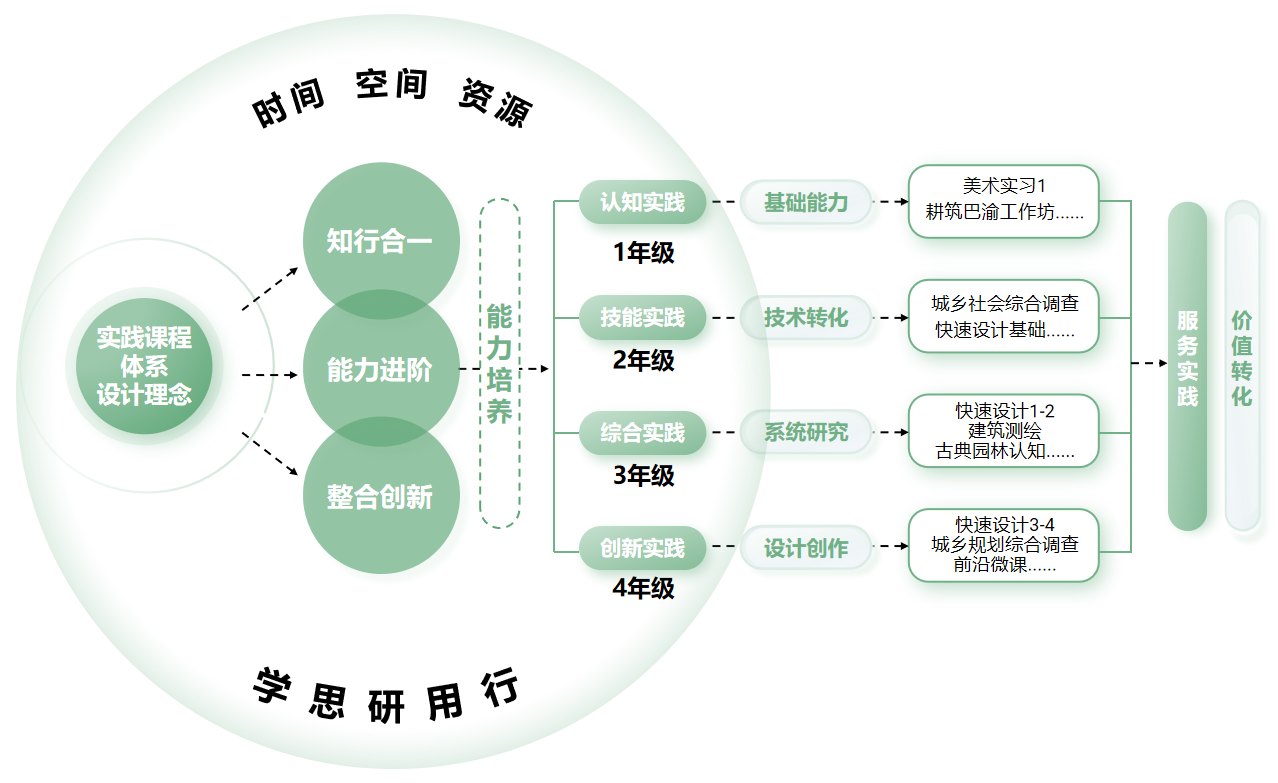 在高等教育“新工科建设”与“质量革命”的浪潮中,伟德体育官网以“三学期制”改革为支点,遵循学生认知规律与发展需求,分年级构建特色鲜明的进阶式课程体系。通过设计“认知-技能-研究-创作-服务”五维进阶体系,将“服务国家战略与地方发展”的价值导向、真实复杂工程场景的浸润、前沿技术的创新融合,以及思政育人的核心理念有机贯穿于人才培养全过程,打造出一条引领学生从“建筑新人”向“卓越设计师”蜕变的特色成长路径。