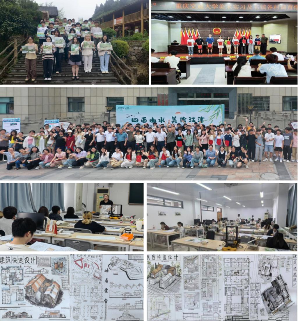 一年级以“感知启蒙”为核心,通过《耕筑巴渝工作坊》乡村实践与基础技能训练,帮助学生深化专业认知。“耕筑巴渝工作坊”立足乡村振兴,以真实乡村建设项目为载体,校地、校企、校校多方协作。通过具有挑战度的任务驱动,学生深入乡村参与实践全过程,在高阶学习与创新实践中提升解决复杂工程问题的能力。教学模式创新强化自主探究与团队协作,让学生在知行合一中涵养工程伦理与公益奉献精神,夯实综合素质根基。先后有200余名大一学生奔赴梁平区铁门乡,运用建筑、规划与园林的复合视角,为村镇产业发展、人居环境提升、文化遗产保护提供综合性技术服务与创意方案,成功开展了“铁门乡韵·墙绘风华”乡村墙绘活动、“铁门乡韵·田园集市”农产品展销节、“铁门乡韵·净美家园”乡村设施优化设计以及“裕农智绘·乡村启航”金融知识普及以及“长塘大讲堂”科普宣传等系列活动。四年来,重庆交通大学师生团队在铁门乡的实践重心不断升级:从初期聚焦传统民居修缮、公共空间优化等人居环境改善工作,到逐步融入文化元素挖掘与业态规划,如今旅游地图的发布,标志着服务从“基础改善”迈向“引流增色”新阶段,为铁门乡乡村旅游发展起到积极推动作用。