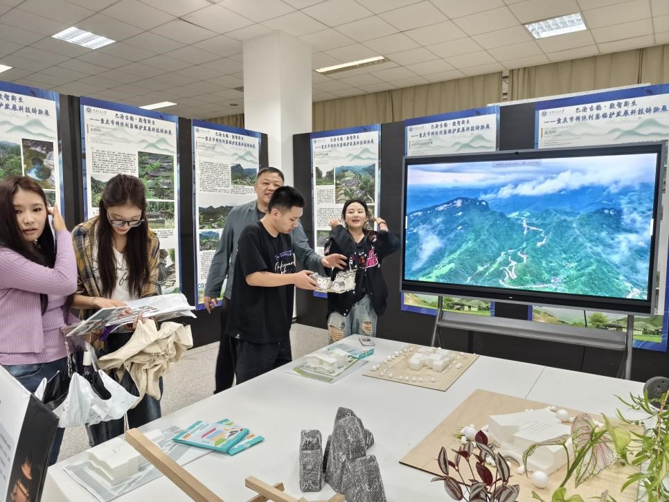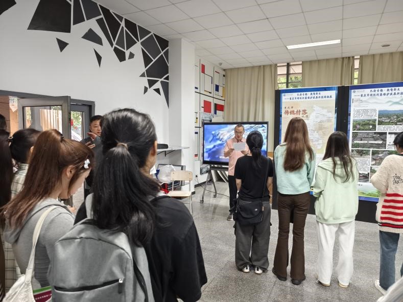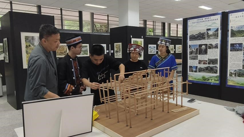 活动在浓郁的民族风情中拉开帷幕。现场划分为四大体验区,吸引了众多师生驻足参与。在“民族村落‘非遗’展”区,数字投影技术将一幅幅承载着民族记忆的画卷动态呈现,从苗绣的精密纹样到侗族大歌的空灵韵律,让古老的非遗技艺在光影中“活”了起来。“民族建筑智慧体验”区则复刻了多个民族的经典建筑构件,参与者们在老师们的专业指导下,亲手操作传统工具,体验榫卯拼接的奥妙,感受各民族在适应自然、营造家园中凝聚的非凡智慧。