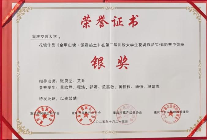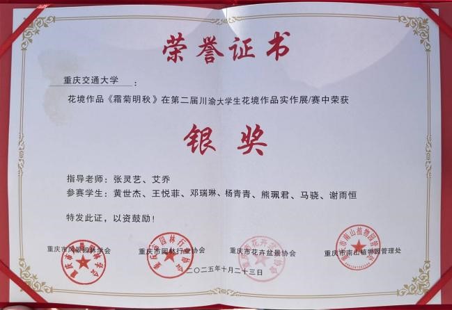 10月23日,重庆市第二十七届菊花艺术展暨第二届川渝大学生花境作品实作赛在重庆南山植物园启幕。伟德体育官网两组参赛作品《霜菊明秋》《金甲山魂·傲霜热土》均在本次比赛中荣获银奖。